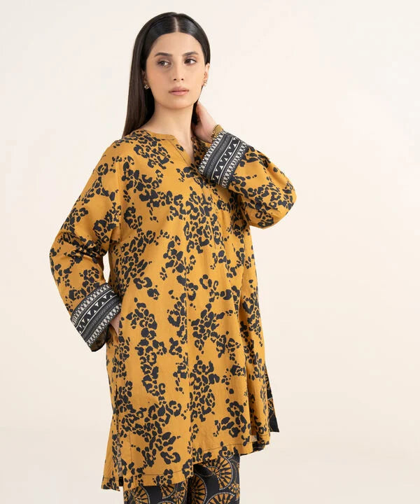 Elevate your wardrobe with our printed brown cambric drop shoulder shirt featuring a band neckline with slit.